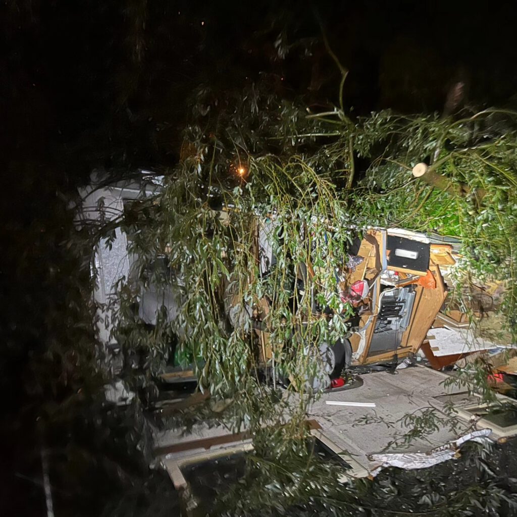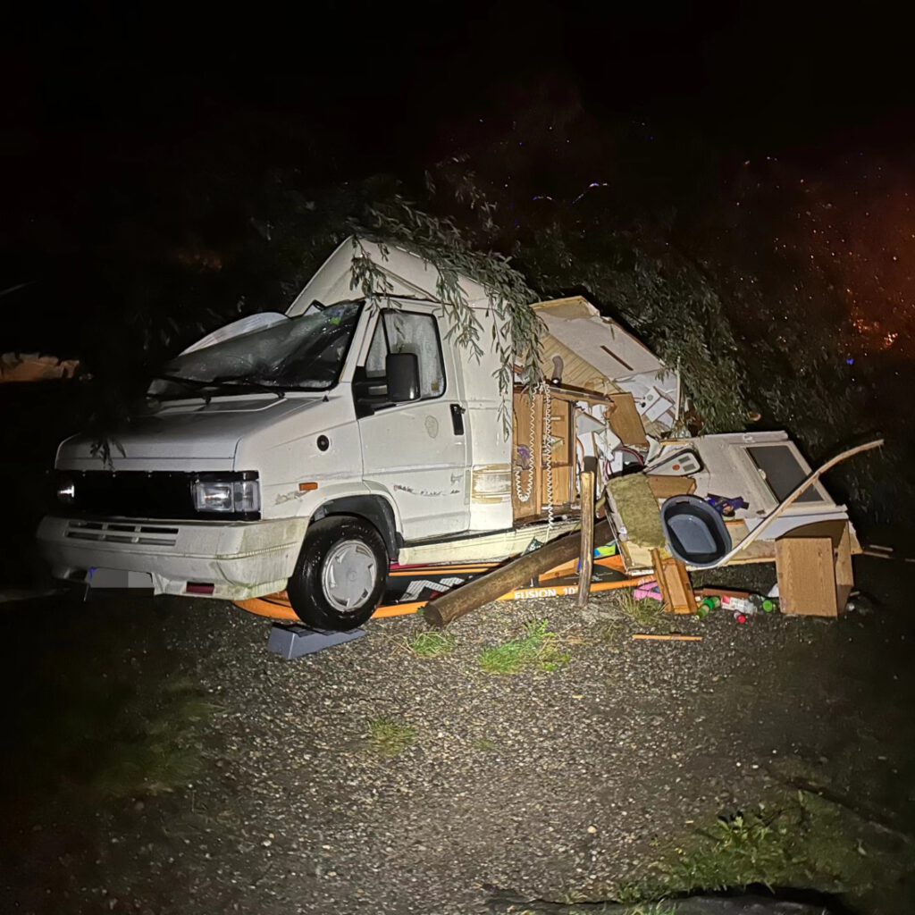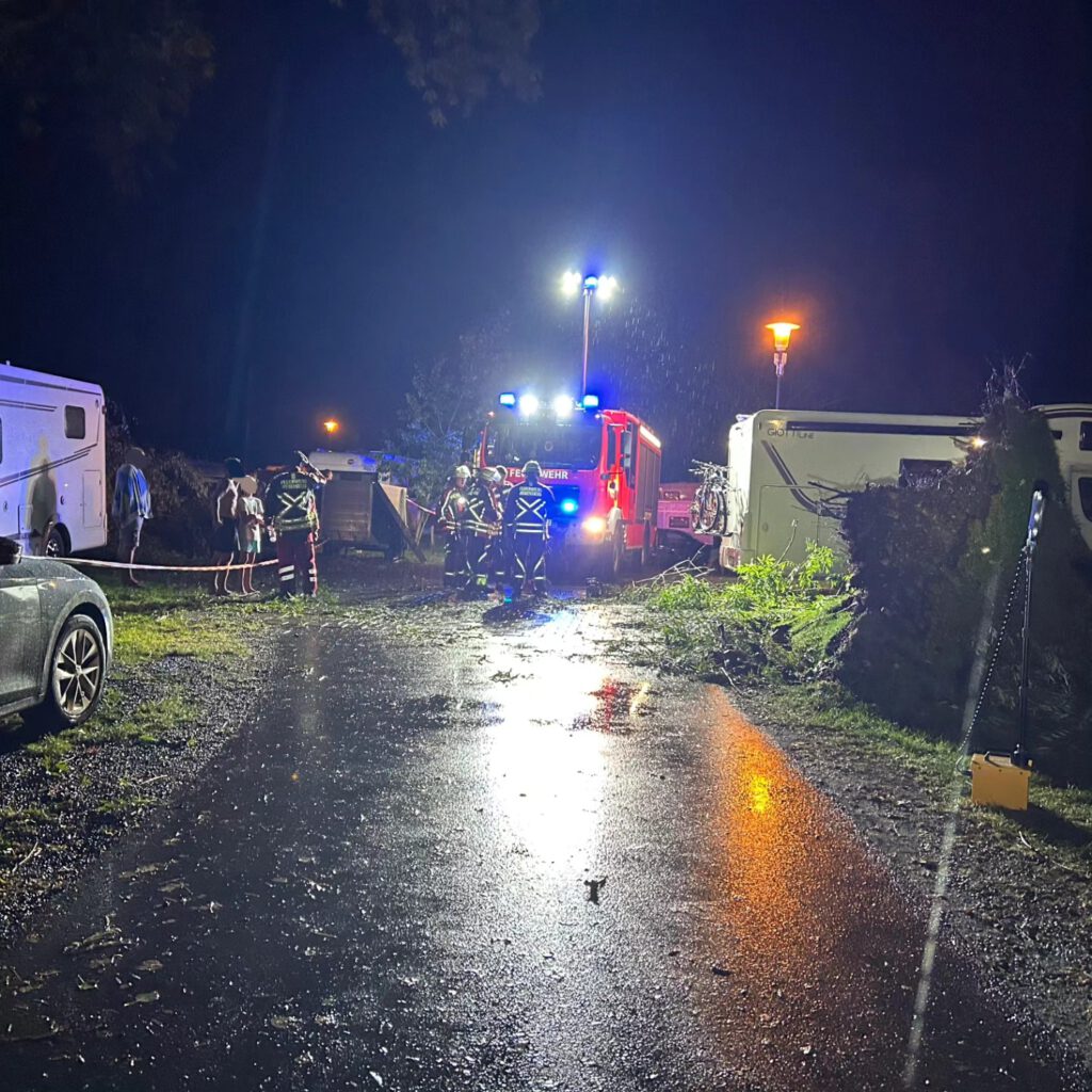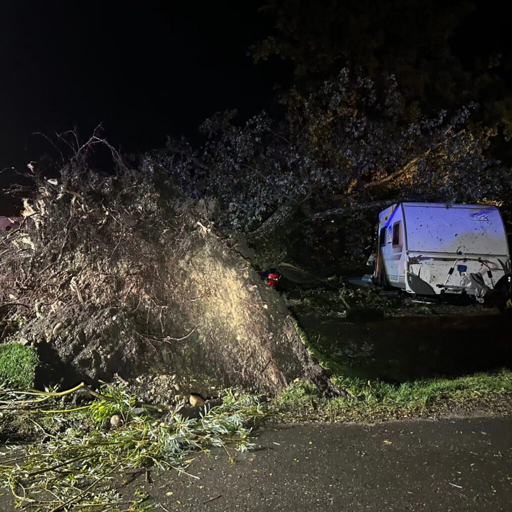An der Einsatzstelle stellte sich heraus, dass mehrere Wohnmobile und Fahrzeuge unter großen Bäumen begraben waren. Anfangs war unklar, ob sich in den völlig zerstörten Fahrzeugen noch Personen befanden. Dies konnten wir glücklicherweise durch Aussagen von Eigentümern und Zeugen und ausführliches Erkunden ausschließen.
