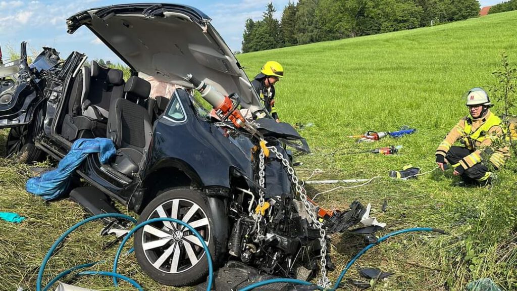 Zusammen mit der Feuerwehr Lindau sicherten wir das Fahrzeug gegen Umkippen und befreiten die Person mittels schwerem Hydraulischen Rettungsgerät. Die Rettung der Person gestaltete sich aufgrund der starken Verformung als äußerst schwierig.